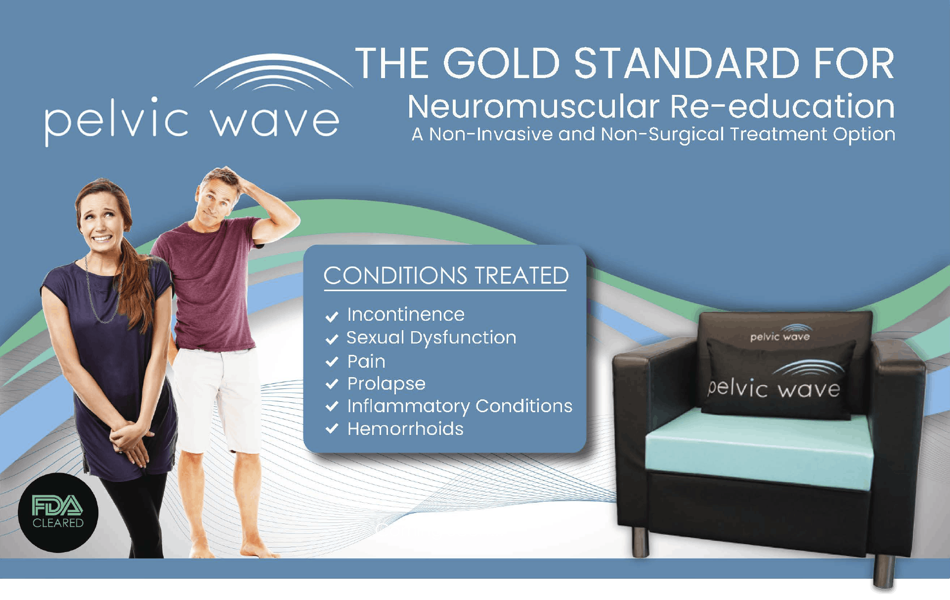 If you’re suffering from incontinence, sexual dysfunction, postpartum pain, leaks, or post-surgical-related pelvic floor issues, we can help. Our Pelvic Wave Chair is a non-invasive way to strengthen the pelvic floor and help you feel your best. We look forward to helping you thrive!